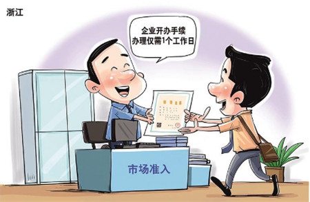 8月15日举办的浙江省政府新闻发布会介绍,近年来,浙江市场监管部门把放宽市场准入门槛作为培育壮大经营主体的重要抓手,通过打造企业开办“一站式”办理新体系,基本实现开办企业“一个环节、一天办结、零费用”。浙江瞄准市场准入堵点、难点,持续深化企业开办便利化改革、“证照分离”改革,创新实施准入准营、迁移、股权转让等“一件事”改革,企业开办手续办理时间从平均8.6天压缩至1个工作日。同时,也瞄准企业服务需求焦点,牵头抓好电子营业执照企业码增值服务试点工作。企业码已在政务服务、招投标、水电气报装、金融、电信等26个领域应用,推动22类电子证照关联展示,全省电子营业执照下载量近800万份。