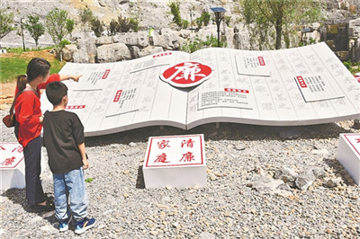4月16日,市民带小朋友在湖南省永州市江永县廉洁文化公园内观看宣传景观。近年来,该县利用废弃矿山,通过微地形处理、艺术景观植入等措施,在原址上建起具有生态、景观、休闲与教育功能的公园,成为市民和游客休闲游玩的好去处和廉政文化宣传新阵地。本报通讯员 田如瑞/摄 《工人日报》(2023年04月18日02版)