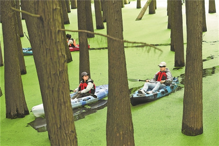 金秋时节,浙江杭州临安青山湖近百亩池杉和落羽杉混交林呈现“抹茶森林”景观,引得大批游客前来泛舟、漫步观光。这片浸没于水中的森林每到秋季就会铺满浮萍,浪漫景观宛如“绿野仙踪”。 图为近日游客在杉树林间泛舟。新华社记者 翁忻旸/摄 《工人日报》(2023年10月29日03版)