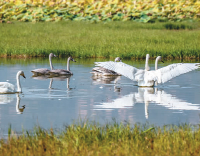 在山西省运城市平陆黄河湿地,前来越冬的天鹅在湿地上或嬉戏、或觅食、或飞翔,成为黄河湿地特有的风景,吸引众多游客和摄影爱好者前来观赏拍照。 近年来,运城市加大对黄河流域生态保护力度,平陆黄河湿地生态环境持续向好,吸引了众多鸟儿前来栖息,已成为鸟儿的天堂。 上图:几只天鹅在平陆黄河湿地栖息。 薛俊/摄(人民图片) 《人民日报海外版》(2023年11月03日第12版)