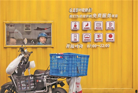 11月4日,在江苏省南通市通州区大润发超市一侧,外卖小哥在爱心驿站?骑手之家休息。该驿站是通州区总工会于2022年初设立,配备了微波炉、饮水机、沙发座椅、书本以及医疗常用物品等,由新就业形态劳动者服务小分队日常管理并在此开展活动,让骑手感受“家”的温暖。本报记者杨登峰摄 《工人日报》(2023年11月06日02版)