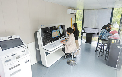 日前,浙江省嘉兴市首家“未来政务服务小厅”在南湖区南湖街道桂苑社区投入使用。该服务小厅集成了219种事项,让居民不出小区就能享受便民服务。同时,服务小厅还开通了智能导服系统,居民在自主办理过程中遇到问题,可直接向智能客服询问。图为4月26日居民正在服务小厅内办理有关事项。