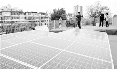 近日,北京市首家碳中和试点校在大兴区第八小学揭牌。该校充分开发利用屋顶闲置空间,安装光伏发电系统,装机容量500千瓦,日最高发电量800余千瓦时。目前,该校用电基本实现碳中和。图为学校屋顶上的太阳能板,记者 周维海/摄。