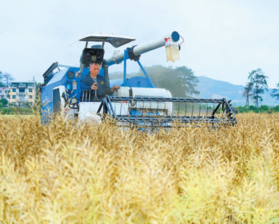江西省宁都县会同乡的油菜进入成熟期,农机手驾驶收割机在收割油菜。朱海鹏/摄(人民视觉)