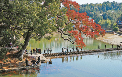 11月23日,游客在浙江省温州市泰顺县泗溪镇北涧桥边观赏树龄千年的乌桕树。 此前,这棵乌桕树随着树龄老化,病虫危害、大枝枯死现象明显。泰顺县管理部门多次邀请专家为古树“把脉会诊”,全力开展古树抢救和复壮工作。 经过一年多的救治,古树焕发生机,红叶灿烂,极具观赏价值,吸引了众多游客。 周汉祥/摄(人民视觉) 《人民日报》(2023年11月26日第02版)