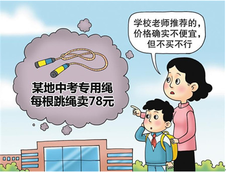 “考试指定这个品牌,学校老师推荐的,价格确实不便宜,但不买不行。”据报道,浙江某地教育部门长期要求中考使用某一品牌跳绳,不少中小学以指定或暗示的方式要求学生和家长购买,每根跳绳价格达78元,远高于市场同类产品。2020年,教育部等五部门印发《关于进一步加强和规范教育收费管理的意见》,明确不得强制或者暗示学生及家长购买指定的教辅软件或资料。如无充足理由,长期通过单一来源采购方式指定采购某一产品,有违市场公平竞争原则。有关部门应进一步完善中考体育跳绳测评方式,包括能否选用更多品牌的跳绳设备等,避免给学生和家长带来不必要的困扰。