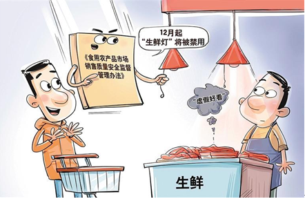 12月1日起,《食用农产品市场销售质量安全监督管理办法》开始施行。办法针对群众反映的“生鲜灯”误导消费者问题,增加了对销售场所照明等设施的设置和使用要求,提出销售生鲜食用农产品,不得使用对食用农产品的真实色泽等感官性状造成明显改变的照明等设施,以免误导消费者对商品的感官认知。据介绍,“生鲜灯”作为一种冷光源,不会散发热量影响食品质量,但却能夸张或遮掩食品的性状,以“虚假好看”影响消费者的决策判断。“生鲜灯”禁用体现了国家对食品安全和消费者权益保护的高度重视。随着办法的实施,更需要商家自律、行业规范和市场监管共同发力,以办法为基准,持续明确实施细则,守护“舌尖上的安全”。