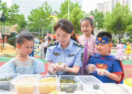 5月31日,弋江区芜师附幼学府壹号幼儿园里,工作人员带领学生们认识饭团上的各种食材。当日,弋江区市场监管局、弋江区教育局走进幼儿园开展“珍爱粮食,