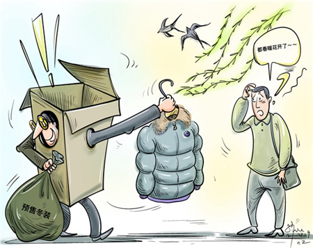 随着预售模式深入到电商产品的各个品类,预售正在成为一些消费者网购时的“噩梦”。不少衣服的预售期7天起步,15天、30天、45天、60天也都见怪不怪。有消费者因天气转冷提前下单买冬装,结果等寒潮过去了,商家还没发货。(《广州日报》1月7日)漫画:徐简 中国青年报(2024年01月10日04版)