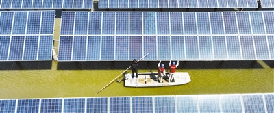 近日,江苏省连云港市赣榆区墩尚镇一处渔光互补光伏电站,工作人员在检查光伏板。近年来,赣榆区通过集约发展,打造水上发电、水下特色养殖的立体化“渔光互补”模式,在生产清洁能源的同时,提高农民收入,助力乡村振兴。