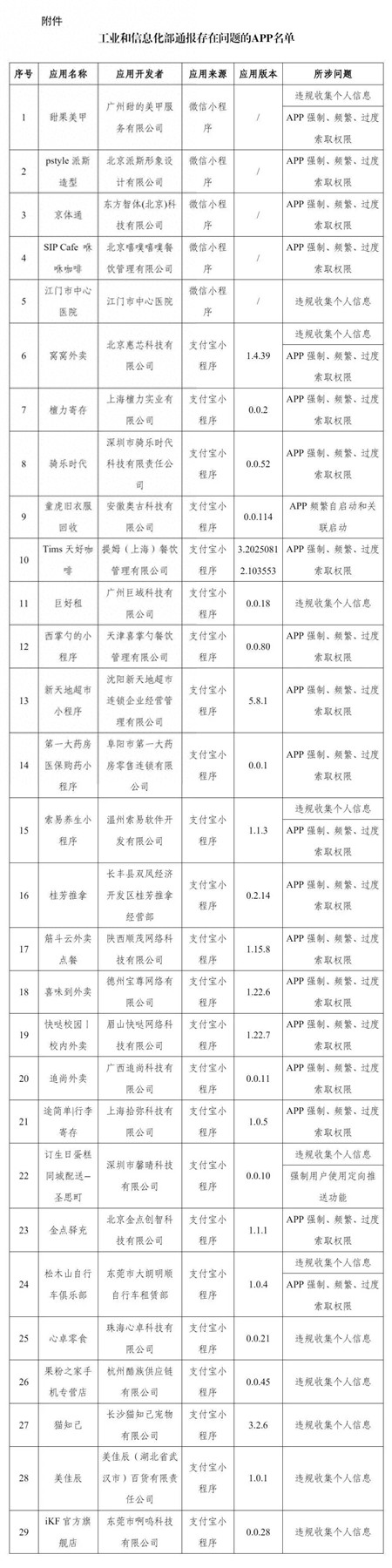 根据中央网信办、工业和信息化部、公安部、市场监管总局等四部门联合发布的《关于开展2025年个人信息保护系列专项行动的公告》,依据《个人信息保护法》《网络安全法》《电信条例》《电信和互联网用户个人信息保护规定》等法律法规,工业和信息化部对App违法违规收集使用个人信息等问题开展治理。近期,经组织第三方检测机构进行抽查,共发现29款App存在侵害用户权益行为(详见附件),现予以通报。