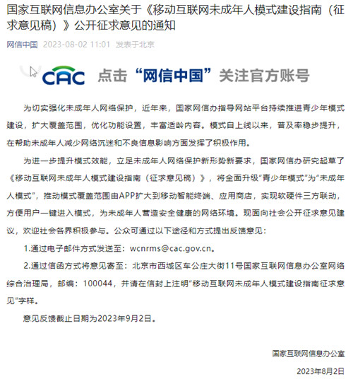 国家互联网信息办公室关于《移动互联网未成年人模式建设指南(征求意见稿)》公开征求意见的通知