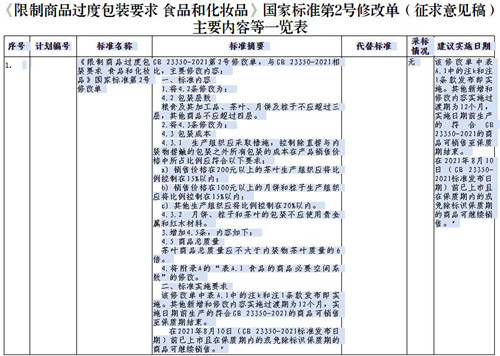 《限制商品过度包装要求食品和化妆品》国家标准第2号修改单(征求意见稿)主要内容等如下: