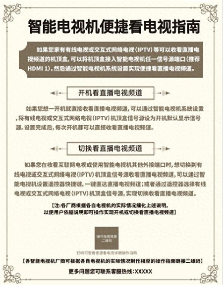 记者11月10日从国家广播电视总局获悉,根据治理电视“套娃”收费和操作复杂工作部署要求,国家广播电视总局、工业和信息化部、国家市场监督管理总局、中国消费者协会决定开展电视收看“明白卡”提示工作。自2023年11月起,各电视机生产厂商要将制作完成的《电视收看“明白卡”》装入电视机包装箱内的说明材料中,同时在电商销售页面、线下实体销售和厂商入户安装电视机过程中,将“明白卡”内容向用户明确展示,并告知用户只有开通有线电视或IPTV方可收看电视直播频道节目。