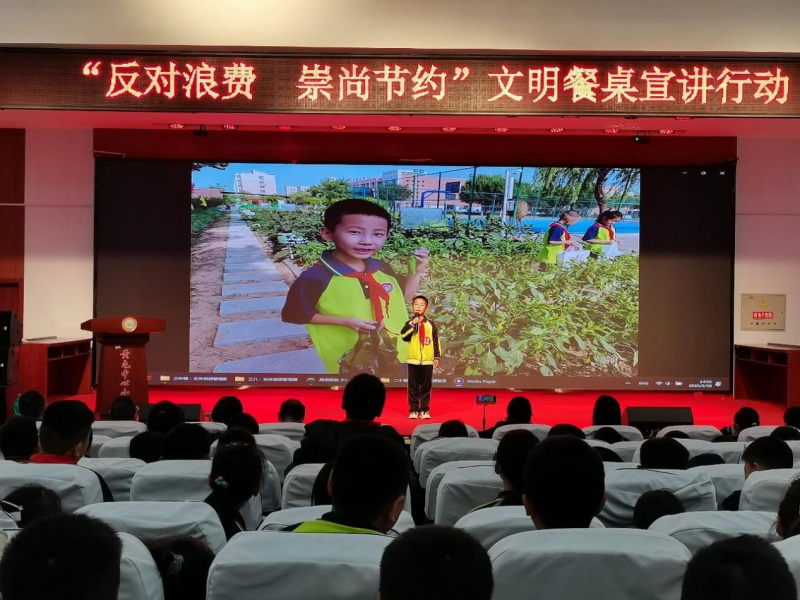 “育秧、插秧、施肥、灌溉、收割……当你吃着香喷喷的米饭时,可知道这小小的一粒粒米是怎样来的吗?”老师们在班会时讲到:“一粥一饭,当思来处不易;半丝半缕,恒念物力维艰。”朴素古训,是对后人的谆谆教诲,更蕴含着中华民族生生不息的“生存密码”。学校还通过校园广播、宣传栏、LED屏幕等多种渠道一幅幅海报展示着粮食从播种到收获的艰辛历程,通过一段段广播讲述着全球粮食短缺的严峻现状,让每一位师生都深刻意识到“舌尖上的浪费”绝非小事。