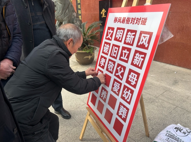 随后,组织村民们一起参与“丢陋习沙包”“移风易俗对对碰”等趣味活动,在寓教于乐中将移风易俗的相关政策进一步深入民心。村民们用力将沙包投掷“陈规陋习”的靶心,将“封建迷信”“大操大办”“天价彩礼”等恶习全部“丢掉”,寓意破旧习、立新风,浓厚移风易俗、倡树新风的社会氛围。在“移风易俗对对碰”活动中,文化礼堂志愿者们将文明标语字块打乱顺序,而村民们则需要调整顺序形成正确的标语。村民们积极参与,热情高涨,不仅锻炼了他们的观察力和记忆力,更在游戏中深刻体会到了移风易俗的重要性。正在玩“移风易俗对对碰”的吴爷爷高兴地说道:“这种玩游戏还真是新奇,收获了快乐,还学习了移风易俗新知识,真是一举两得。”而在旁边的张阿姨也笑着说:“是啊,真的挺好玩的,回去后也一定会向邻居们做好宣传,养成更文明的生活习惯。”