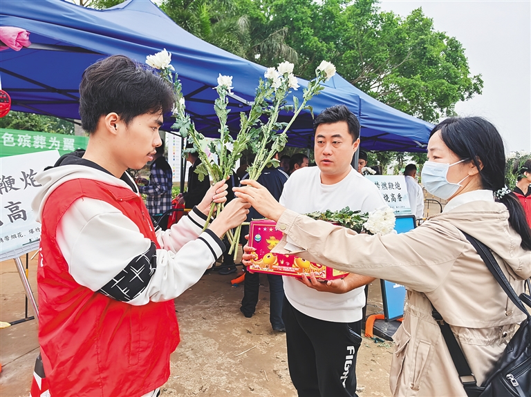 海口颜春岭安乐园内,志愿者为前来扫墓的市民发放鲜花。记者 黄婷/摄
