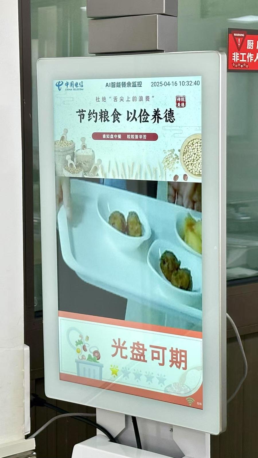 数字赋能还体现在餐盘回收处,这里新安装了全市首台智能餐余监控机器,能便捷识别用餐者是否“光盘”。只要端着托盘靠近,摄像头便会识别到盘内剩余的食物,根据不同的剩余量,大屏上会显示“光盘可期”“节粮进阶”“光盘达人”等,志愿者也会据此进行提醒。