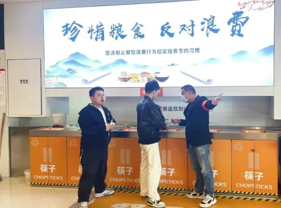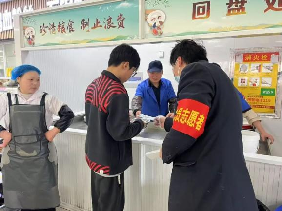 组织党员志愿者团队统一佩戴“节约监督员志愿者”红袖章,在食堂就餐高峰期轮流值班,对发现有浪费食物倾向的师生,及时上前友好提醒,倡导适量取餐,宣传节约理念。