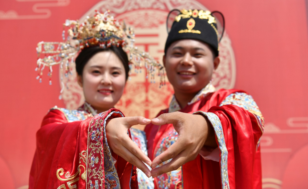 5月2日,中国献王第七届汉文化节系列活动——“双争有我、缘定今生”2025明制汉仪集体婚礼在河北省献县龙港公园举行。九对新人身着华美汉服,以抵制铺张浪费、倡导移风易俗为承诺,通过一场融合传统礼仪与现代文明理念的婚礼,为文化节注入新风尚。活动以周礼为蓝本,通过“古礼今承”的形式,既彰显中华礼仪文化的厚重底蕴,又传递简约庄重的婚俗理念。