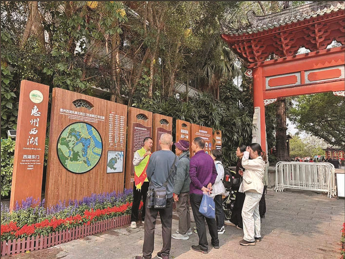 志愿者在惠州西湖为游客作讲解。记者 骆国红/摄