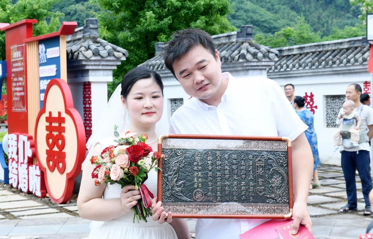 一对新人手捧主办方颁发的铜制《婚书》,以示一生的约定