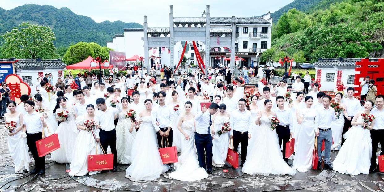 当天,江西省德兴市在凤凰湖景区和兴古街举办了一场“铜德同心、德之有兴”大型集体婚礼活动,吸引了省内外52对新人积极参与,104位来自该市各行各业的新人,在现场观众和美丽的凤凰湖的见证下,带着满满的幸福,喜结良缘,用行动倡导文明,节俭结婚。