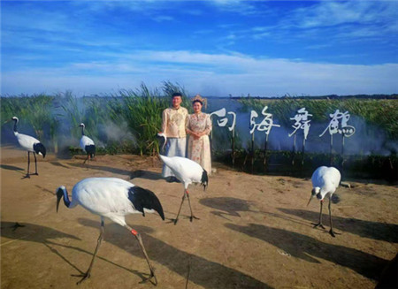 向海秋色迷人,碧波荡漾,芦苇随风舞动,丹顶鹤凌空展翅。新人们携手在蓝天白云下、清水碧草间,在象征着爱情忠贞的丹顶鹤面前,十指相扣,紧紧依偎,把此刻幸福的印记,留在这片美好的湿地中。