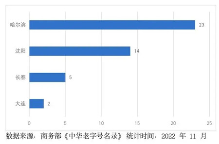 商务部“中华老字号品牌”城市数量数据显示,哈尔滨拥有23家“中华老字号品牌”,沈阳、长春、大连分别有14家、5家、2家“中华老字号品牌”。