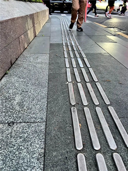 从实际使用风险来看,不锈钢盲道的弊端十分突出。其一,防滑性能堪忧,一旦盲道表面沾染水或油,就会变得异常湿滑,不仅对视障人士构成严重安全威胁,普通行人、自行车骑行者及电动车驾驶者也容易因此滑倒摔伤;其二,高温危害显著,夏季漫长且气温居高不下,不锈钢导热性强的特点会使其表面温度急剧升高,行人不慎接触便可能遭遇接触性伤害;其三,眩光干扰问题,不锈钢表面易产生强光反射,形成的眩光会干扰周边行人、骑手乃至机动车司机的视线,给道路通行安全埋下隐患。
