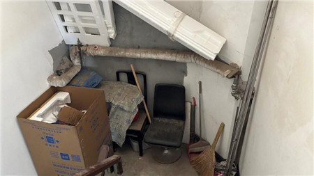 而从一楼走到五楼顶层,每一层的住户门口,以及楼层间拐角处,都堆放着各式杂物。从泡沫箱到成摞的纸盒,从柜子椅子到梯子,统统搁在屋外,将楼道里塞得满满当当。尤其五楼至四楼的拐角处,几把椅子、桌子、扫帚、纸箱一堆,仅能容人侧身通行。