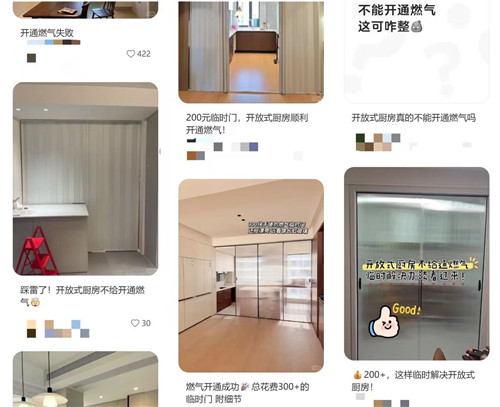 社交平台上甚至已经出现了应对检查的“教程帖”。有几位住户称,加装阳光板临时门、PVC材质的门依然无法通过检查,改装耐力板门或玻璃门后才能成功。广东佛山一住户靠安装自闭阀、复合报警器、排风扇、平衡式热水器,就成功给开放式厨房通了燃气。有住户除了加装这些安全装置外,又每年花100元购买了保险。