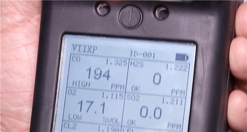 左图为实验前室内气体数值,右图为关闭门窗、打开油烟机几分钟后的气体数值。一氧化碳含量由0ppm上升至194ppm(70ppm为高报警数值);氧气含量由实验开始前的20.6%Vol下降至17.1%Vol以下(19.5%Vol为仪器低报警数值)。