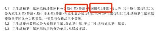 比如,在《卫生纸(含原纸卫生纸)》标准里,用原生纸浆做的纸分为三个等级,优等品、一等品和合格品(优等品的质量最好,一等品其次,合格品排最后)。即便是用原生纸浆制作的合格品,它的品质也是比回收纸浆制作的卫生纸要高。