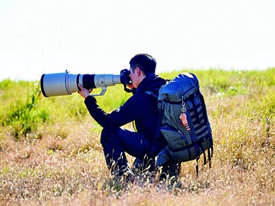 一位摄影爱好者用租来的镜头在户外拍摄。光明图片