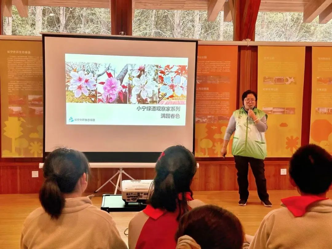 随后,生境联盟专家王吟以“《森林学院》第五课之‘满园春色’低碳课堂”为主题,带领参与者踏上一场生动的生态探索之旅。时值三月花期,专家通过现场讲解和互动问答,介绍了上海春季开花的代表性植物,如樱花、玉兰、海棠等,并科普裸子植物与被子植物的区别。学生们边观察边记录,志愿者也互相分享着日常绿化维护经验。“原来我们身边的植物藏着这么多科学知识!”新泾中学初二学生感慨道。课程将理论与志愿者的实践经验结合,激发着青少年对生态保护的关注与行动力。