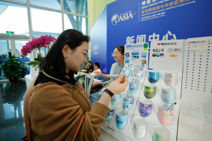3月26日,在博鳌亚洲论坛2025年年会新闻中心,一名媒体工作者在领取可降解按动中性笔。记者 杜潇逸/摄