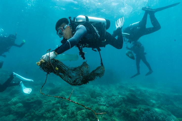 蜈支洲岛旅游区工作人员在水下清理渔网等固体垃圾。新华社发