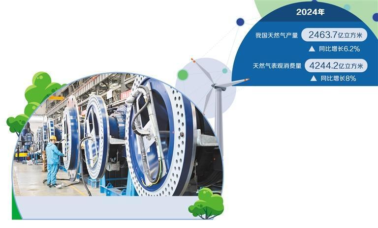 《油气产业蓝皮书》显示,2024年,我国天然气产量达2463.7亿立方米,同比增长6.2%,连续8年保持增产100亿立方米以上。天然气表观消费量为4244.2亿立方米,同比增长8%;天然气出口总量为60.2亿立方米,同比下降7.3%。在管道建设方面,全国新增天然气管道里程超过4000千米。