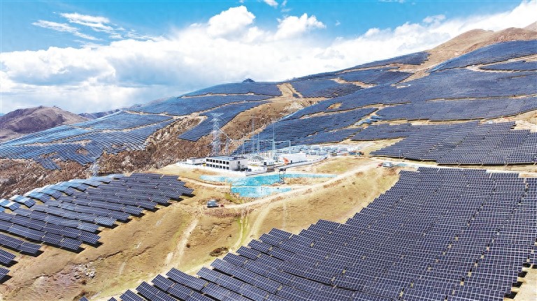 位于拉萨市墨竹工卡县扎西岗乡的华能拉萨扎西岗100兆瓦光储发电项目,是自治区2023年保障性并网清洁能源项目。该项目采用“牧光互补”模式开发,通过“板上发电、板间种草、板下放羊”,可实现生态环境保护、清洁能源发展、土地高效利用、群众增收致富的“多赢”局面。图为华能拉萨扎西岗100兆瓦光储发电项目现场成片的光伏板。洛克/摄