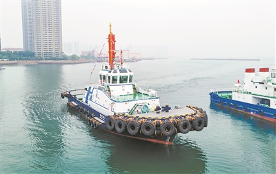 四艘拖轮迎着风,稳稳驶向远处即将进港的大船。其中,一艘拖轮身姿矫捷。它个头不大,动力却异常强劲,船身上“氢电拖1”四个大字格外醒目。