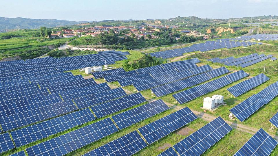 近日,山西省阳泉市盂县牛村镇教场村光伏基地,一排排光伏发电板在阳光照射下熠熠生辉,源源不断地输出绿色电能。近年来,盂县通过利用荒山坡、厂房屋顶建设光伏电站,实现农村生产生活节能减排,推进能源绿色低碳转型。(程瑜/摄)