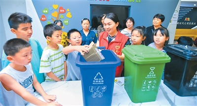 江西省宜春市袁州区秀江街道袁山社区,志愿者教居民如何正确垃圾分类,让绿色低碳理念更加深入人心。周亮/摄(人民图片)