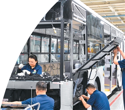 在交通领域,新能源技术让车船更低碳环保。图为工作人员在河南省郑州市宇通新能源厂区海外承装车间作业。记者 郝源/摄