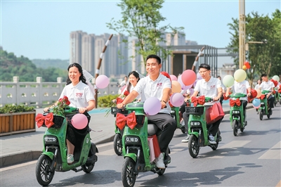 四川省宜宾市长宁县举行集体骑行婚礼,新人们沿着河畔骑行5.2公里,倡导低碳环保的婚俗新风尚。庄歌尔/摄(人民图片)