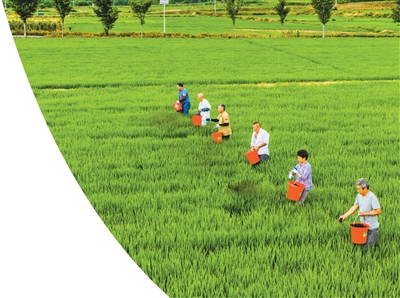 江苏省南京市溧水区晶桥镇探索施用炭基有机肥对农田土壤进行改良,抵消水稻生产中的碳排放,实现农田生态系统的碳平衡。图为南京市溧水区晶桥镇芝山村的“零碳稻田”里,村民正在施浇炭基有机肥。朱红生/摄(人民图片)