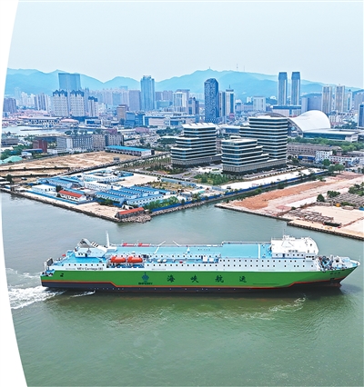 新能源汽车运输船“绿安通”为新能源汽车用户提供跨海运输服务。图为“绿安通”轮从锚地驶入山东省烟台港。孙文潭/摄(人民图片)