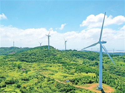 浙江省玉环市充分利用海岛风能资源丰富的优势,大力发展风力发电。图为玉环市大麦屿街道十五亩村山顶上,一座座风力发电装置迎风矗立。段俊利/摄(人民图片)