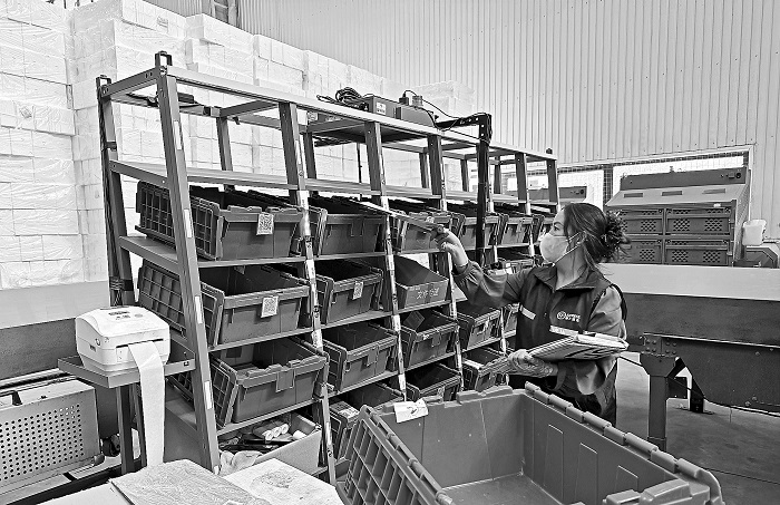 8月6日,顺丰西藏拉萨中转场内,快递分拣员边巴正在往文件封循环箱内投递文件。目前,该中转场使用文件封循环箱,替代此前的纸箱,可循环使用数月。甘皙/摄