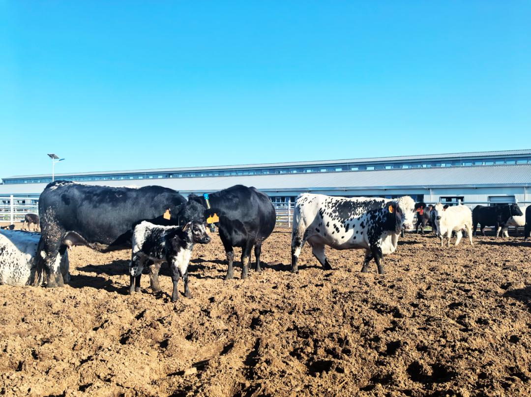 据悉,在牛棚屋顶及周边空地铺设的光伏板,装机容量12MW,年清洁发电量超过2000万千瓦时。年节约标准煤6000余吨、减排二氧化碳20000吨,助力伊金霍洛旗碳达峰目标。光伏板遮挡阳光降低舍内温度,减少牛只热应激;板下种植耐阴牧草,提升土地利用率,形成“牧光互补”;场区周边光伏阵列间种植苜蓿等优质牧草,形成“电+饲草”双产出,形成“草光互补”。